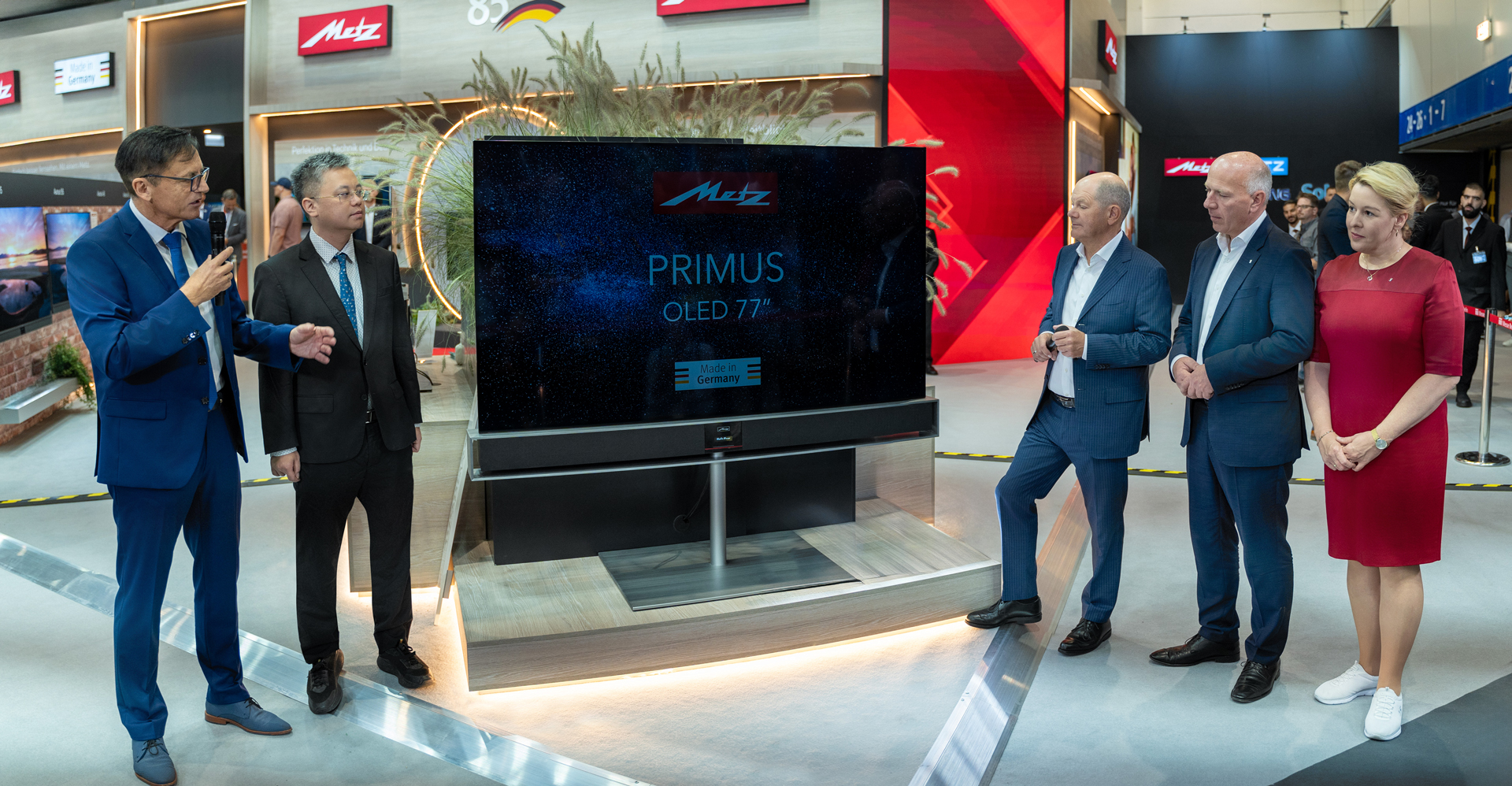 På den første dag af IFA 2024 besøgte den tyske kansler Olaf Scholz METZ' stand. Han oplevede METZ' innovative højteknologiske produkter og roste dem i høj grad. Det produkt, der især tiltrak den tyske kanslers opmærksomhed, var METZ' flagskibsprodukt, Primus OLED 77 - et produkt, der kombinerer billedkvalitet, akustisk kvalitet og design i topklasse. Kansleren spurgte om, hvorfor TV'et blev kaldt "Primus". "Fordi dette TV er et af de bedste med hensyn til billedkvalitet, akustisk kvalitet og design," forklarede Dr. Kotzbauer, administrerende direktør for METZ. Kanslerens besøg fremhævede METZ' indflydelse på high-end-markedet, nærede begejstringen for den fremtidige teknologiske udvikling og styrkede METZ' tillid til at udforske og ekspandere på det europæiske marked. METZ udtrykker oprigtig taknemmelighed for muligheden for at dele dette historiske øjeblik med medierne og forbrugerne.