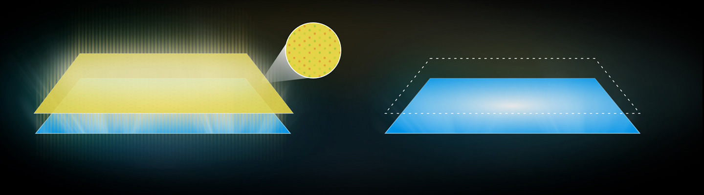 *Det brede farvespektrum er sammensat af røde og grønne materialer, der visuelt præsenterer en gul farve. Når det blandes med den blå baggrundsbelysning, opnås en renere farvebåndbredde af hvidt lys for et bredere farvespektrum.