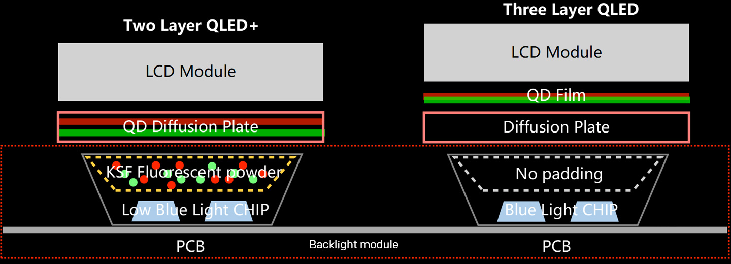 QLED+Princippet bag METZ QLED+ (fjerde generation af QLED) er at sammenlægge kvantepunktfilm og diffusionspladestruktur ved kun at bruge ét lag for at opnå den endelige brede farveskala. For at afhjælpe problemet med utilstrækkelig kvantepunktkoncentration i kvantediffusionspladen bruges bred farveskala-baggrundsbelysning til at supplere farveskalaen, og endelig bruges den nye struktur til at opnå en visningseffekt, der ligner traditionelle kvantepunkt-tv'er.