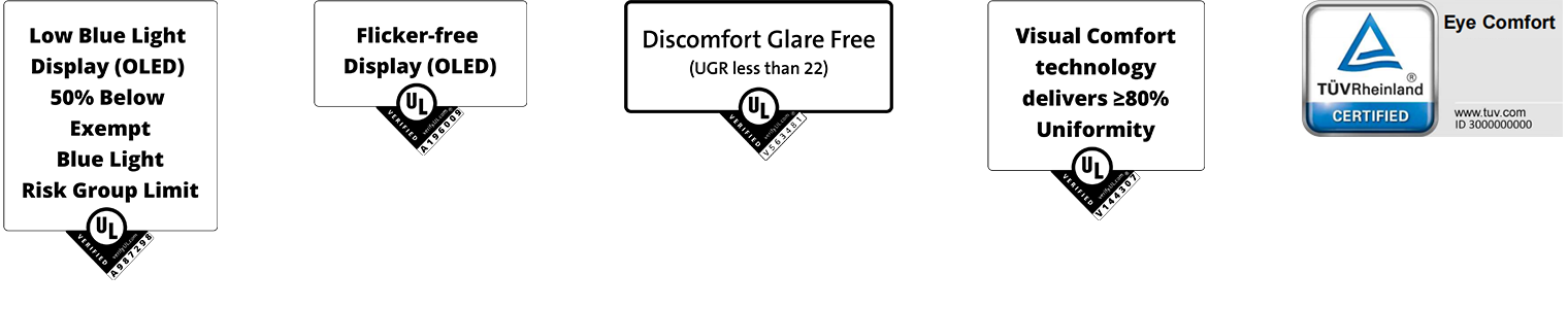 *OLED-paneler er blevet certificeret af Underwriter Laboratories (UL) som værende med lavt blåt lys, flimmerfri, genskinsfri, visuel komfort takket være høj ensartethed og perfekt sort.